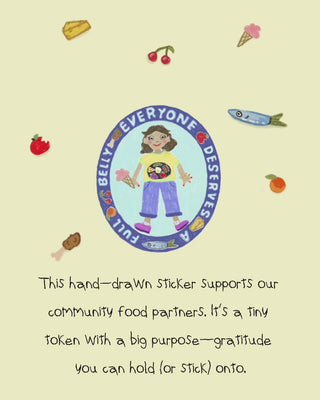 This hand-drawn sticker supports our community food partners. It’s a tiny token with a big purpose—gratitude you can hold (or stick) onto.